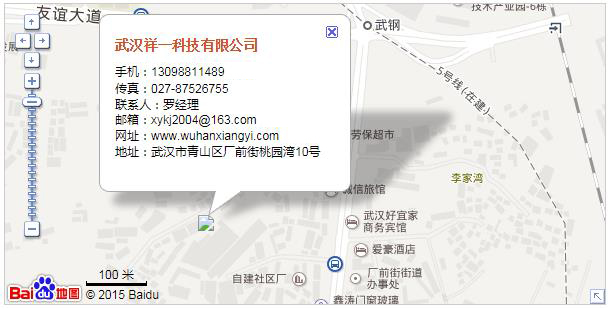 手机:13098811489 传真:027-87526755 联系人:罗经理 邮箱:xykj2004@163.com 网址:www.wuhanxiangyi.com 地址:武汉市青山区厂前街桃园湾10号